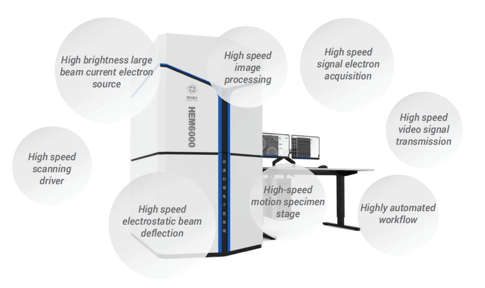 CIQTEK HEM6000 dispune de tehnologii precum tunul de electroni de curent cu fascicul mare de înaltă luminozitate, sistemul de deviere a fasciculului de electroni de mare viteză, decelerarea etapei de probă de înaltă tensiune, axa optică dinamică și obiectivul combinat electromagnetic și electrostatic de imersie pentru a obține imagini de mare viteză, asigurând în același timp o rezoluție la scară nanometrică.